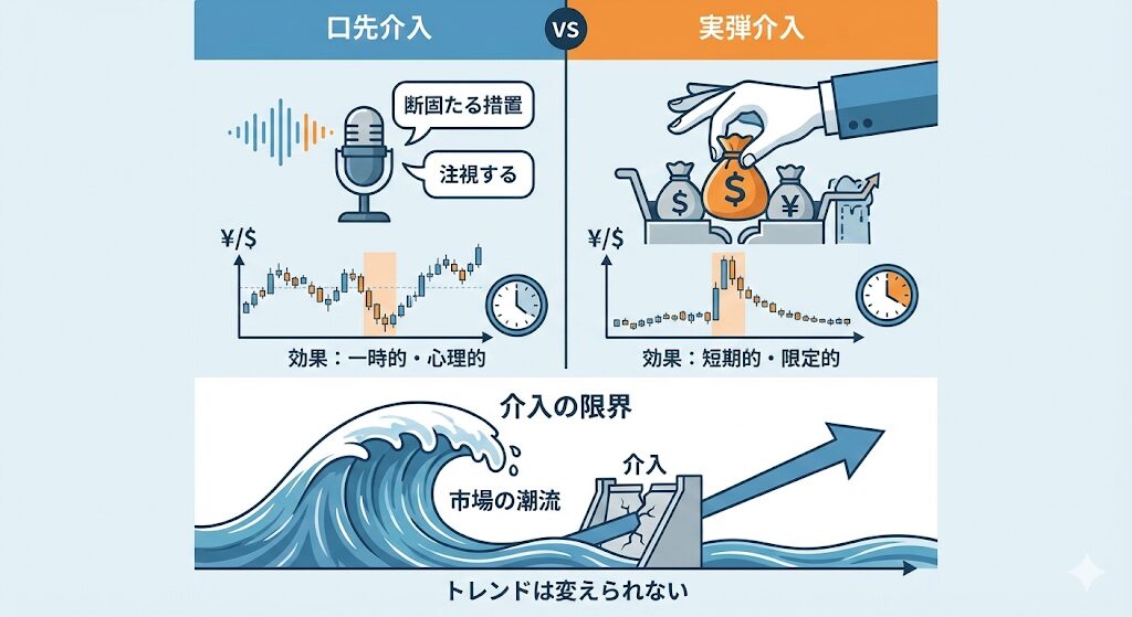 - 為替介入は一時的な効果しかなく、根本的な金利差は解決できない