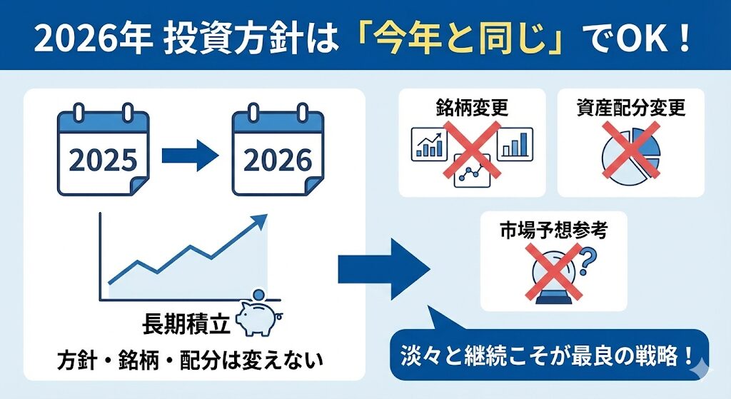 「今年と同じ」が、最良の戦略です。新しい銘柄を探す必要も、資産配分を変える必要も、市場予想を参考にする必要もありません。ただ、2025年と同じように、淡々と積み立てを続ける。それだけです。