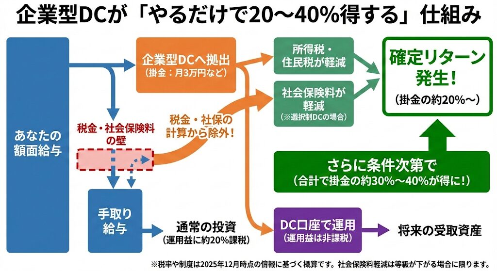 つまり、企業型DCに拠出するだけで、何の運用リスクも取らずに約30%のリターンが確定するということ。これが「やるだけで得する」と言われる理由だ。
