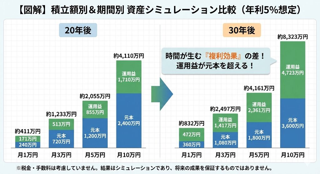 さらに、運用益も非課税(※一部制限あり)なので、長期的には複利効果も加わります。