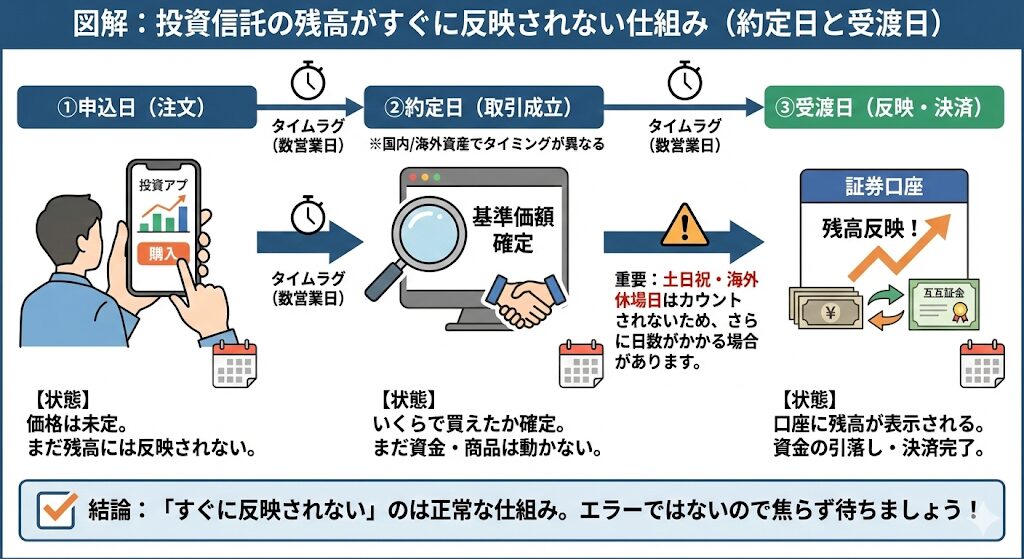 投資信託の残高がすぐに反映されないのは、システムの不具合でも証券会社のミスでもなく、取引の仕組みそのものによるタイムラグです。