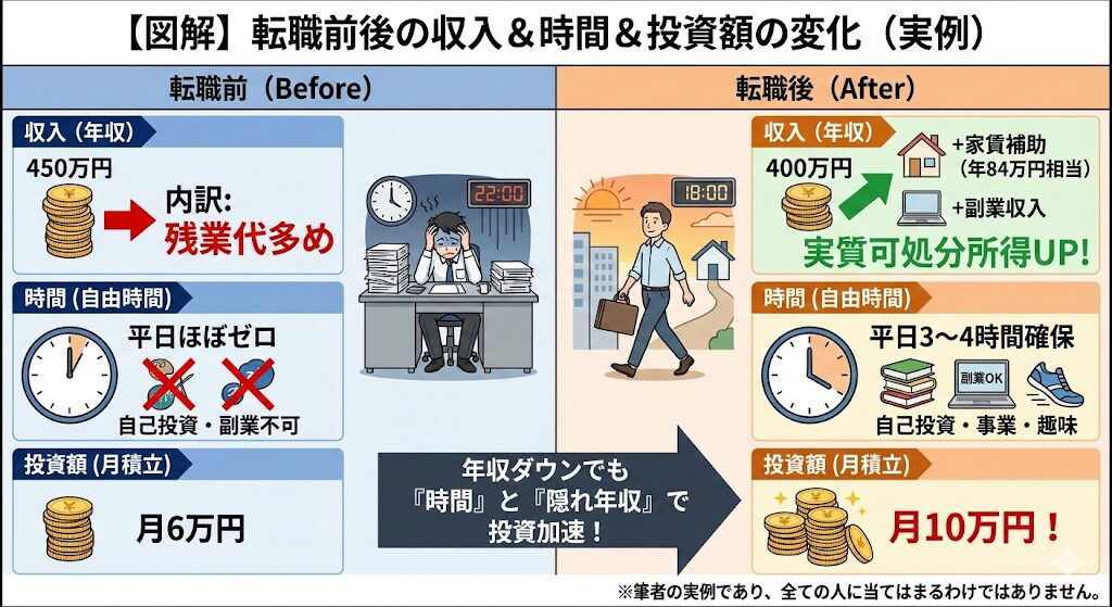実質的な可処分所得は増えた 月の積立投資額は6万円から10万円に増えた 時間が増え、やりたいことに挑戦できるようになった 精神的に安定し、前向きに生きられるようになった