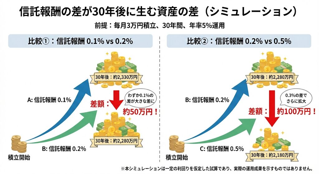 わずか0.1%の差が、30年後には数十万円、場合によっては100万円以上の差を生むことがあります。しかも、この差は市場環境に関係なく、確実に発生するコストです。