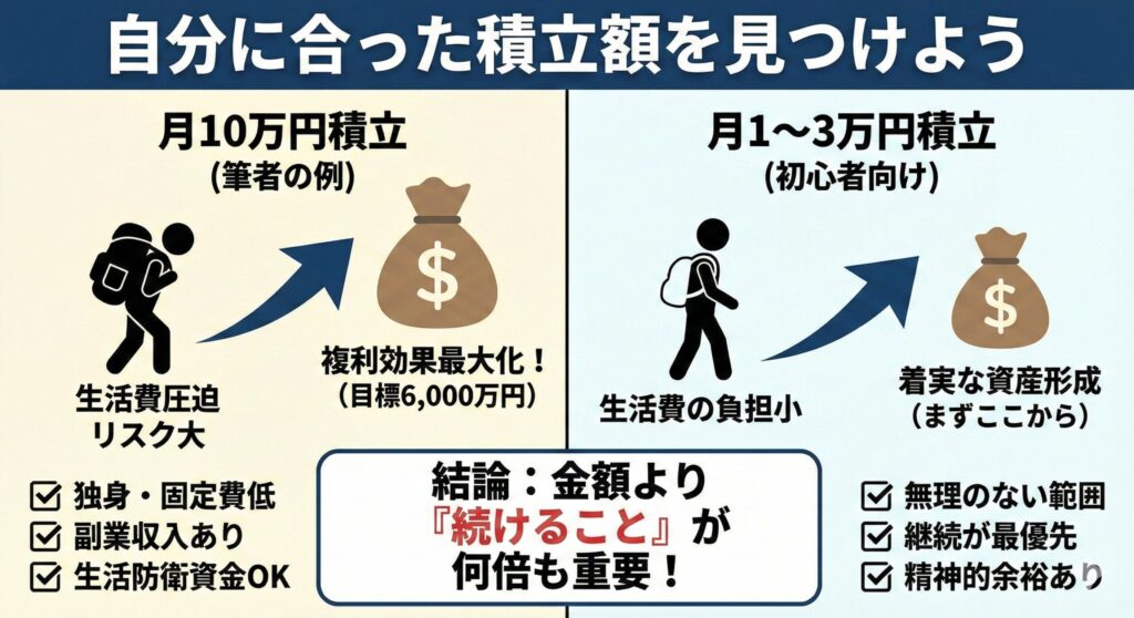 月10万円が正解なわけではありません。月1万円でも、月5万円でも、自分の状況に合った金額を選ぶことが大切です。