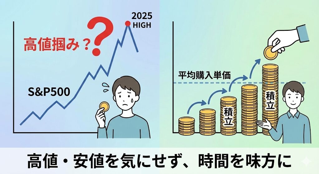 「インデックス投資は高値掴みになるのでは?」という不安は、投資を始める人なら誰もが感じるものです。2025年7月に積立を始めた際、私も同じ不安を抱えていました。