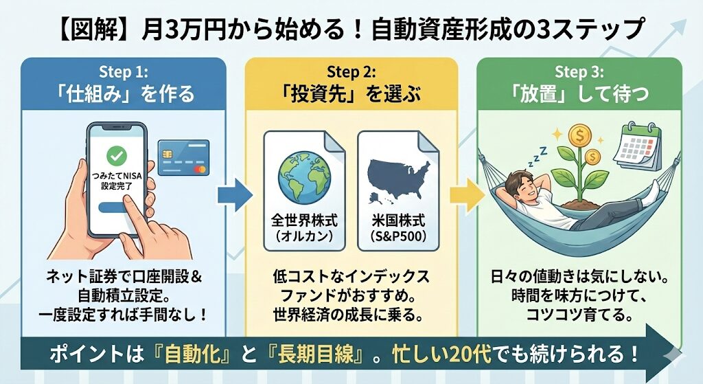 20代のうちは仕事もプライベートも忙しく、毎日相場を見ていられません。だからこそ、”自動で続く仕組み”を先に作ることが重要です。