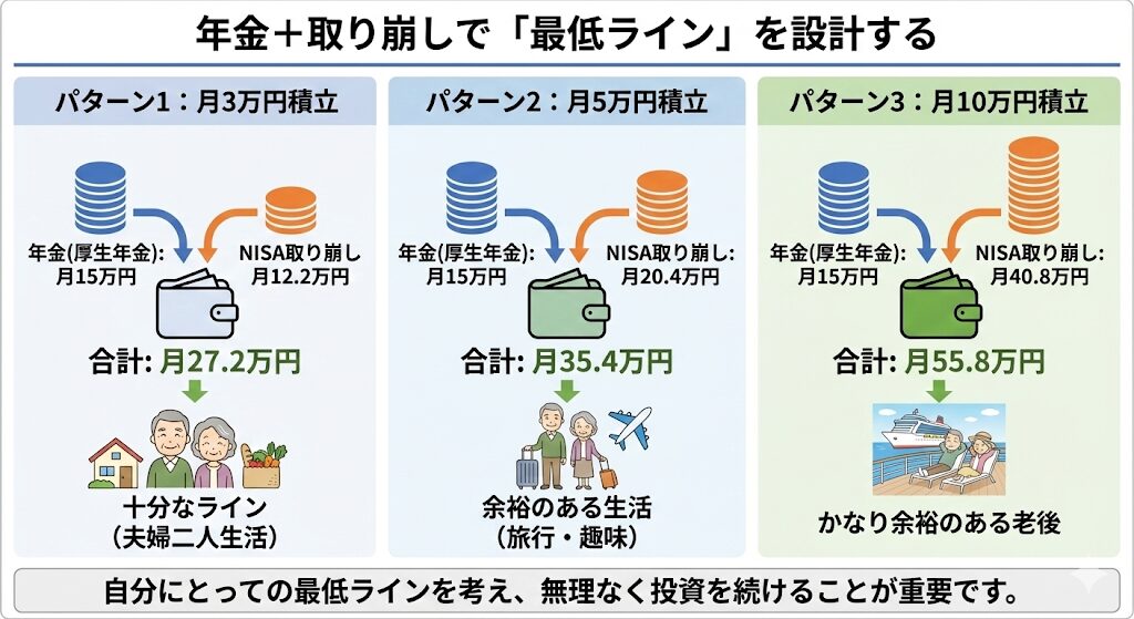 この記事でいう「最低ライン」とは、年金+取り崩しで「生活が破綻しない状態」を指します。