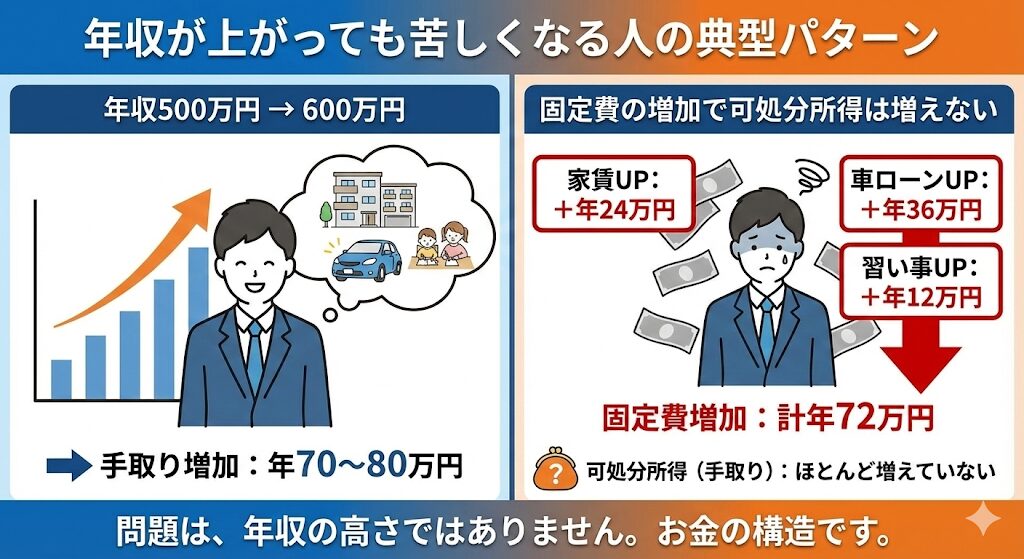 手取りが増えても、固定費が増えれば、可処分所得は増えません。